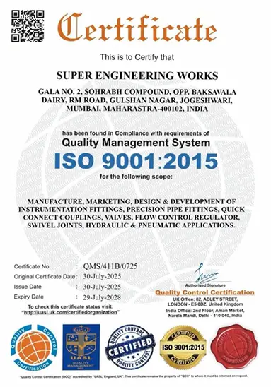 At Super Engineering Works, quality is not just a process — it is our promise. Every instrumentation fitting and valve we manufacture is built with precision, rigorously tested, and certified to meet both national and international standards. Our dedicated quality team monitors every stage of production to ensure consistent performance, durability, and safety.